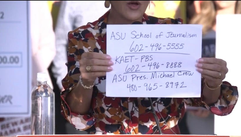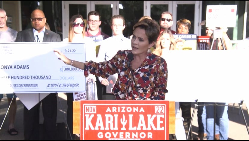 +5.) Bringing photo-opportunity-worthy visuals and covering the entire background space with them sufficiently enough that no photo could have been taken of the press conference without mentioning the visuals, while also forcing any honest reporter to then mention the visuals if any video or photo footage of the event is captured. In this instance, she has big checks, big checks of state payouts to settle racial discrimination cases that Katie Hobbs (her opponent) was involved in.